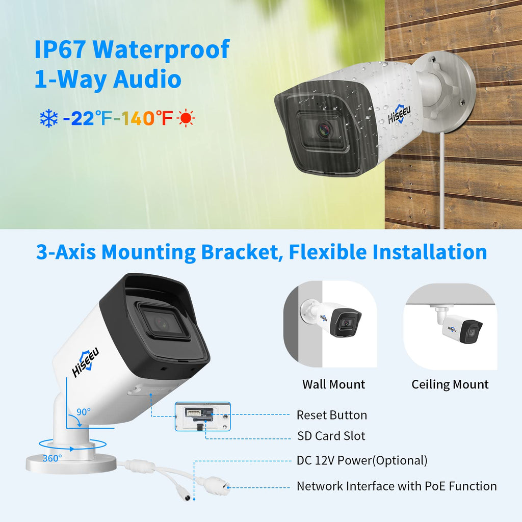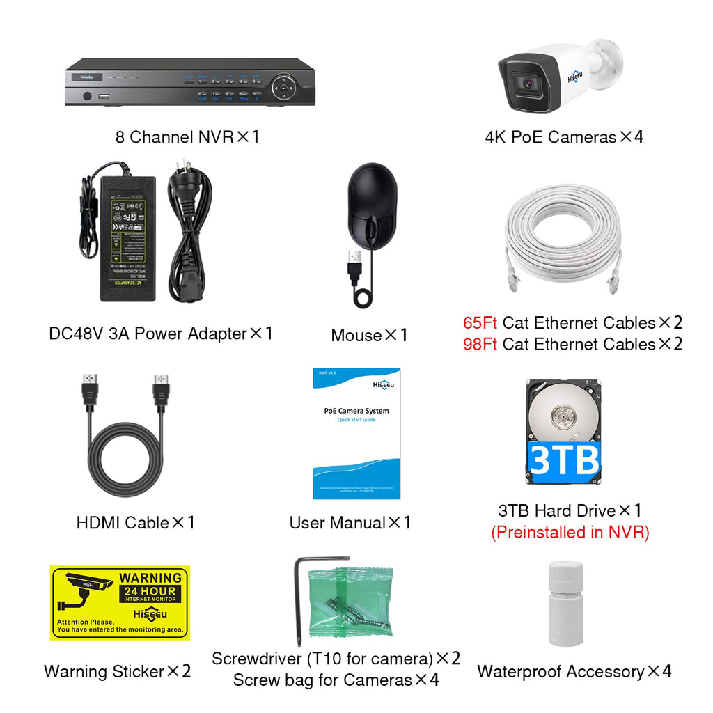 Hiseeu 4K 8MP PoE Security Camera System, 8CH 8MP Surveillance NVR with 4Pcs Outdoor IP Network Bullet Security Camera, 1-Way Audio, 3TB Hard Drive, 100ft Night Vision,IP67 Waterproof,Works with Hikvision