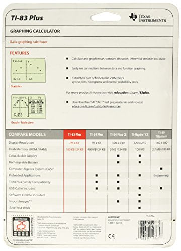 This easy-to-use graphing tool is essential for classes ranging from algebra through pre-calculus and biology to physics. It also includes advanced statistics and financial features. Enhanced with Flash technology, this handheld gives you the flexibility to add TI-83 Plus software applications and additional functions beyond math and science, providing long-term value. These reasons and more have made the TI-83 Plus the best-selling graphing calculator in the U.S. and Canada.