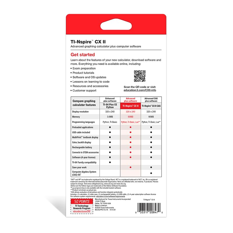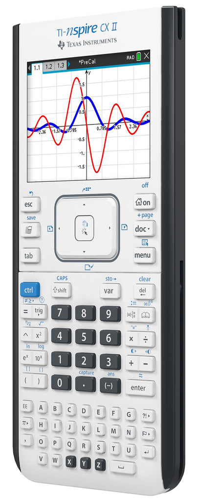 Details: Familiar functionality, added capability Faster performance, added interactive visuals and easier-to-read graphics expand the TI-Nspire™ CX graphing calculators' classroom-proven ability to support inquiry and discovery. New features open new paths to understandingCreate opportunities for hands-on engagement with added interactive features. Animated path plot Visualize function, parametric and polar graphs as they are drawn in real time. Dynamic coefficient values Explore direct connections between dynamic coefficients in equations and graphs. Points by coordinates Create dynamic points defined by coordinates, sliders or expressions quickly. Tick-mark labels Label axes scales to create visual contexts that promote understanding. Python programming Program easily with this coding language that's great for STEM classes and more. Easier-to-read graphics New app icons, supported by color-coded screen tabs, improve the user experience. Built on a proven foundationFrom the keyboard and computer-menu interface to the ability to save and share work with built-in apps, the TI-Nspire™ CX II models retain the features and functionality that make TI-Nspire™ CX graphing calculators ideal for math and science from middle grades through college. Calculator Perform computations and enter expressions, equations and formulas in proper math notation. Lists & Spreadsheet Perform mathematical operations on data and visualize the connections between the data and their plots. Graphs Plot and explore functions, equations and inequalities, animate points on objects and graphs, use sliders to explain their behavior and more. Data & Statistics Summarize and analyze data using different graphical methods such as histograms, box plots, bar and pie charts and more. Geometry Construct and explore geometric figures and create animations. Notes Enter notes, steps, instructions and other comments on the screen alongside the math. Vernier DataQuest™ Application Create a hypothesis graphically and replay data collection experiments all in a single application. Programming Add new functionality and create rich STEM activities with Python and TI-Basic coding languages.