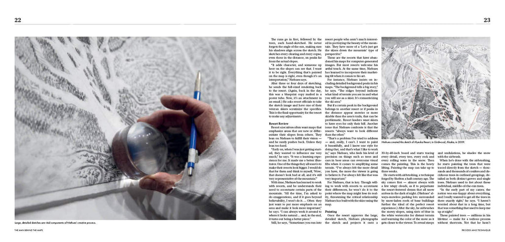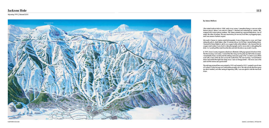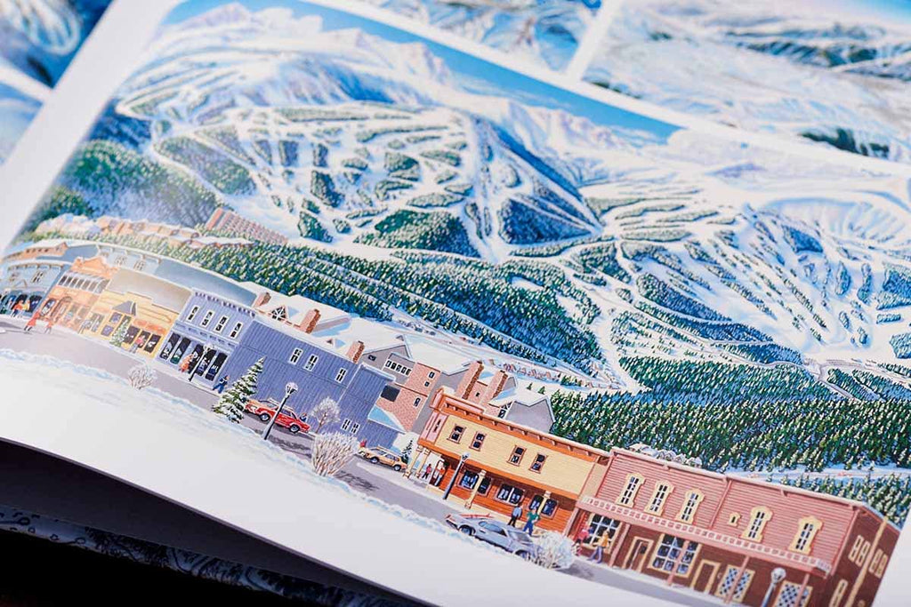 Details: Featuring over 200 ski resort trail maps hand-painted by one legendary artist, this beautiful 292-page hardcover coffee table book is the first and definitive compilation of the art created by James Niehues during his 30-year career. Eight geographically themed chapters form the heart of the book, offering you full-page images of the world’s most iconic ski areas including Alta, Arapahoe Basin, Aspen, Breckenridge, Big Sky, Deer Valley, Heavenly, Jackson Hole, Jay Peak, Killington, Kirkwood, Lake Louise, Mammoth, Mont Tremblant, Mt. Bachelor, Park City, Revelstoke, Snowbird, Squaw Valley, Stowe, Sugarloaf, Sun Valley, Taos, Telluride, Whistler Blackcomb and other renowned resorts. In engaging narrative that complements the maps, Niehues reveals his exacting technique, which demands up to six weeks to complete a single painting. He then walks you through the step-by-step process for mapping Breckenridge, sharing everything from aerial photographs, to numerous pencil sketches, to in-progress builds, to the final trail map illustration. The magic of the finished product is captured in both a foreword by pioneering big-mountain skier Chris Davenport and the perspectives of other ski industry insiders. Every detail was taken into consideration: Italian art-quality printing, heavier weight matte coated paper and a lay-flat binding. A pencil sketch of Big Sky, Montana, graces the cover and features anti-scratch protection. The book is 11.5” tall and opens to a spread of 24” wide, the perfect size to showcase the biggest ski mountains in the world.