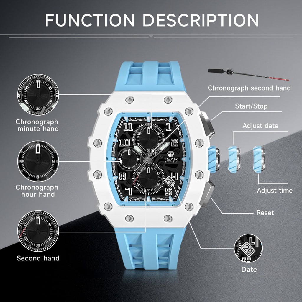 - [TSAR BOMBA-Exploring the Unknown X] TSAR BOMBA men's watch features a novel double-arch bridge tonneau-shaped case design with a personalized skeletonized oil-press texture, combined with three simple and practical chronograph dials, which are stylish and very flattering to the wrist. The mirror is made of imitation sapphire glass, which fits perfectly with the 316L stainless steel case. Also, the A-grade luminous function allows you to see the time at night without hurting your eyes.