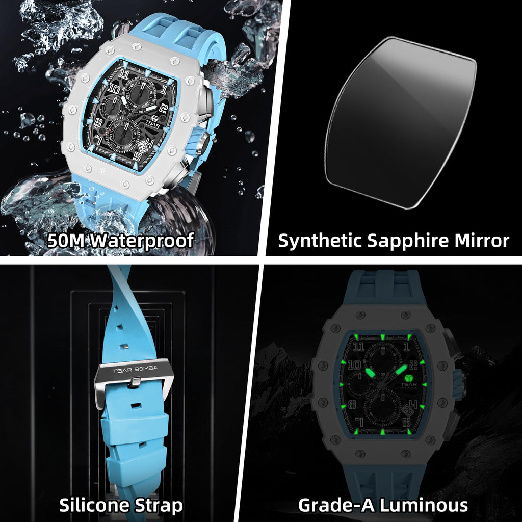 TSAR BOMBA Watch for Men, 50M Waterproof Mens Watches, Luxury Tonneau Black Watch with Silicone Watch Bands, Japanese Quartz Movement Chronograph, Gifts for Men
