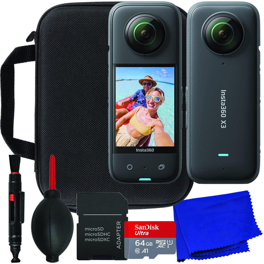 - Bundle Includes: Insta360 ONE X3, Manufacturer Accessories, SanDisk 64GB micro SDXC Memory Card, Water-Resistant Action Camera Case with Pre-Cut Foam Inserts, Gadget Cleaning Pen, Dust Blower, Microfiber Cloth